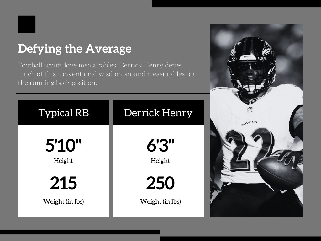 Conventional wisdom for the running back position has long dictated that the ideal size for the position is around 5’10” and 215 lbs. This combination provides a decent mix of power and speed to be effective in the modern game. There have been a few exceptions to this thinking, for instance Hall of Famer Eric Dickerson was 6’3”. But even Dickerson met the weight requirement of 220 lbs. Derrick Henry, measuring in at 6’3” and 250 lbs., defies any sense of conventional wisdom.