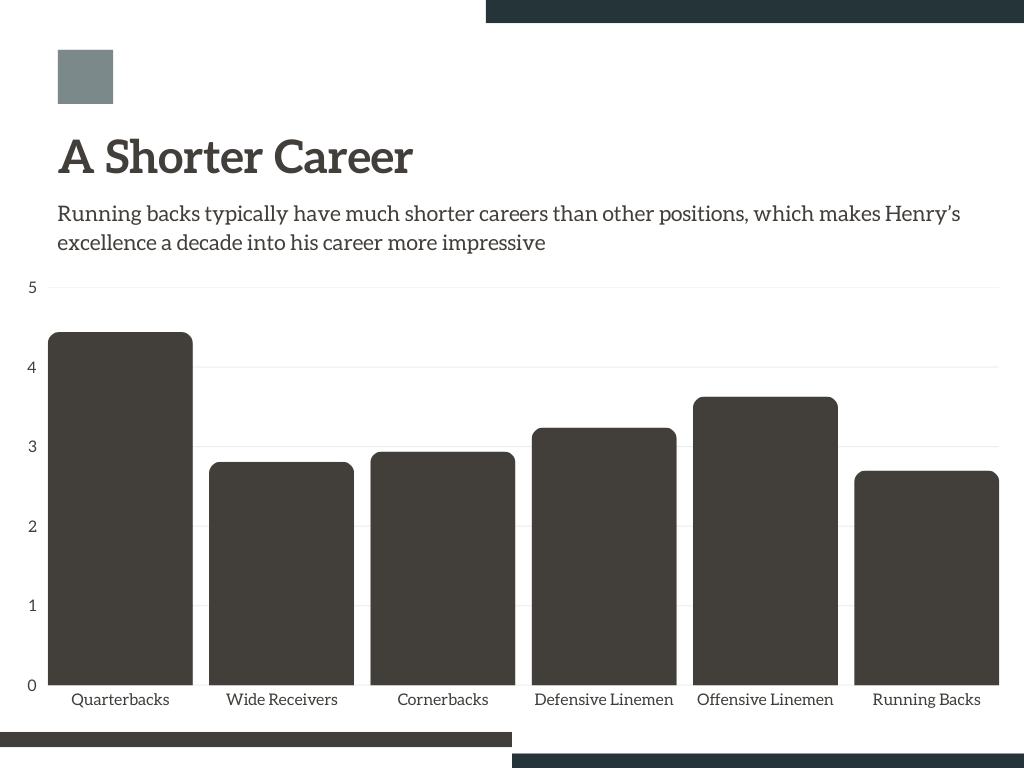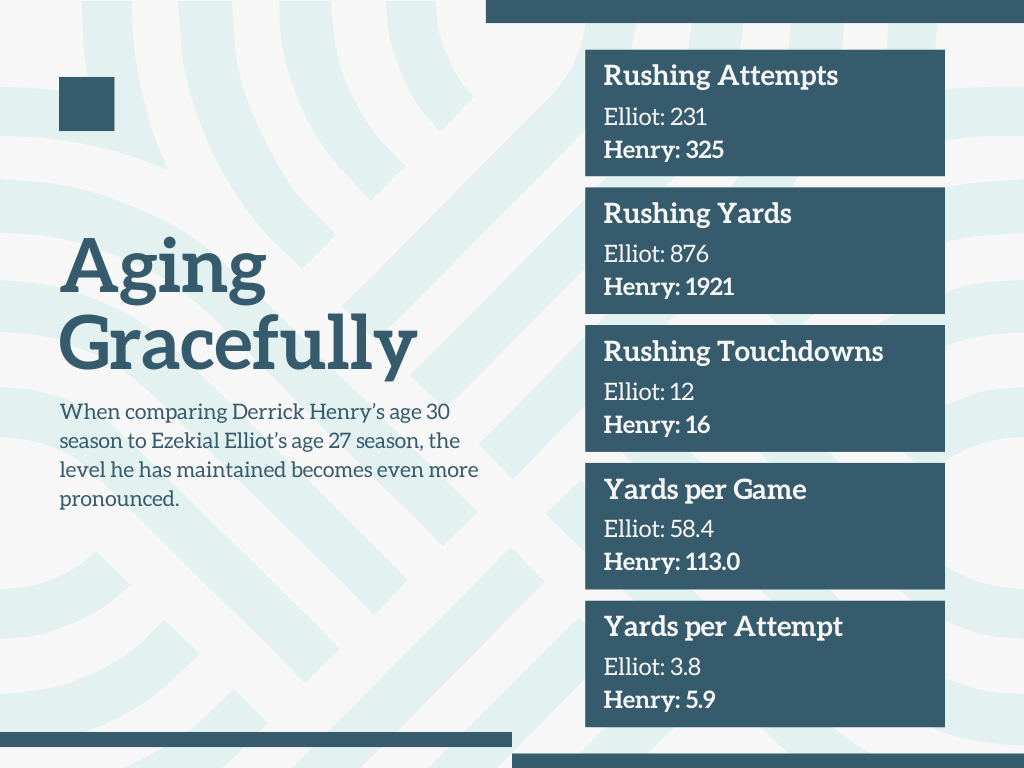 A running back’s career is typically only 2.57 years long and Henry is still running strong in his tenth season. Consider Henry in comparison to someone like Ezekiel Elliot. Elliot was an elite talent at the position and played for nine seasons in Dallas and New England. He led the league in rushing yards twice and received MVP votes as a rookie. After his seventh season he slowed down significantly and was out of the league before he turned 30. Henry, meanwhile, has proven to be a modern phenomenon of the position, continuing to get better as he ages—a true anomaly of the era.