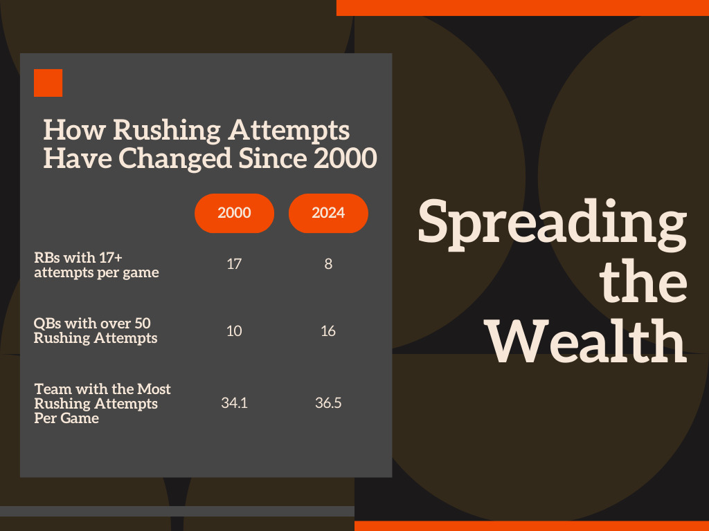 In 2000, Daunte Culpepper led all quarterbacks in rushing attempts with 89 attempts, one of 10 different QBs that accumulated more than 50 carries in that season. In 2024, both Lamar Jackson and Josh Allen registered more than 100 rushes each, and 16 quarterbacks had over 50 rushing attempts. The running quarterback has gone from a niche curiosity to a staple of the best offenses in the league. Those attempts come at the expense of the every-down back.